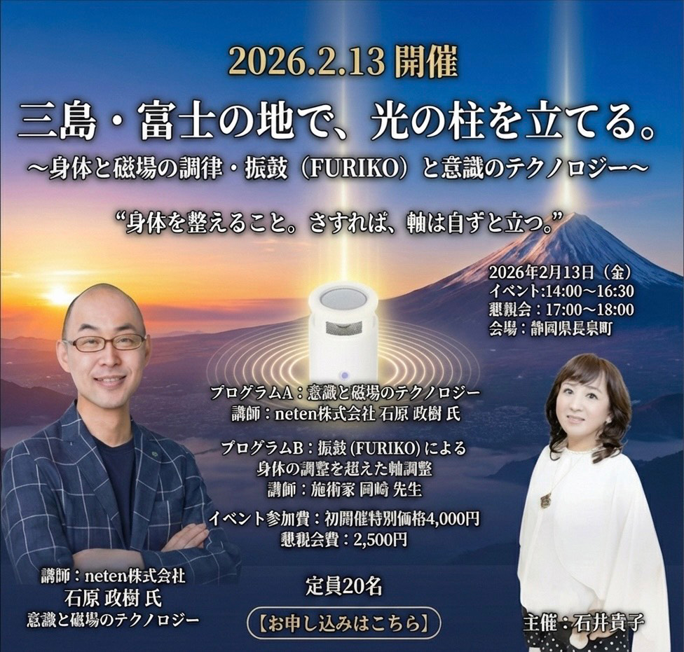 2026年2月13日(金)、富士山のエネルギーと深く結ばれた三島の地にて、身体と意識、そして磁場を整える特別イベントを開催いたします。