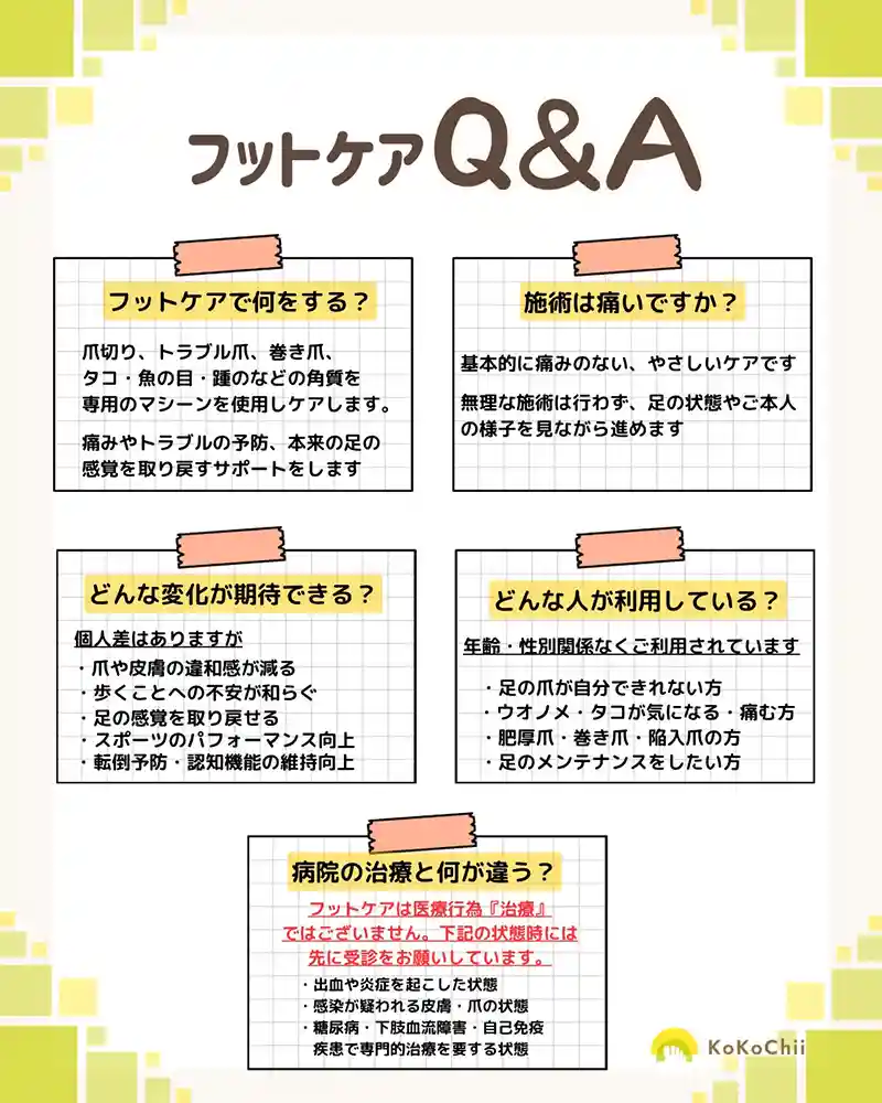 「KoKoChii(ここちいい)」は、足の爪や角質などのお悩みに対応する専門フットケアサービスです。